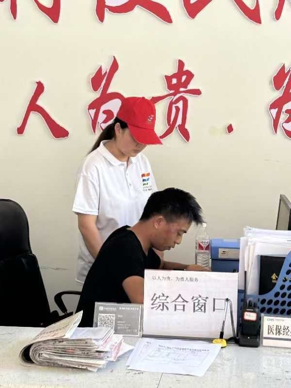 (图为实践队成员为村委工作人员答疑解惑)