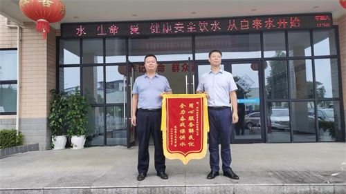 9月14日上午,湖南省汝城县暖水镇镇长何嘉俊将一面印有“用心服务解民忧,全力奋战保供水”的锦旗送到汝城县鑫荣自来水公司董事长蒋华芳的手中,并激动地说:“感谢县鑫荣自来水公司对暖水镇在恢复安全用水问题上给予的大力支持与帮助!”