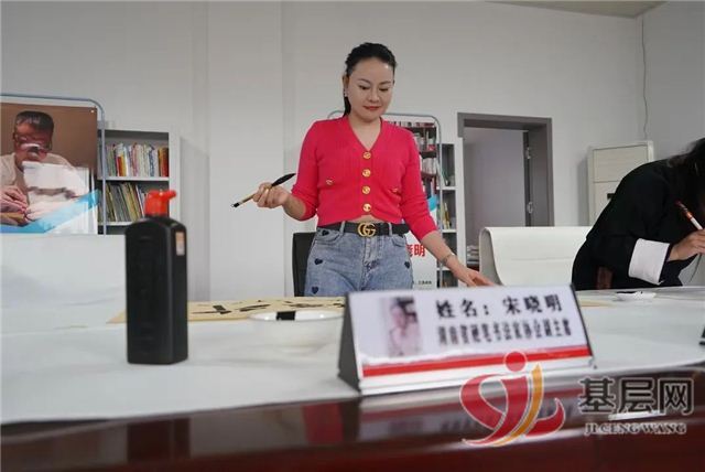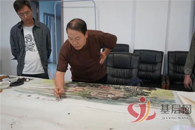 在洪潮村部的二楼,来自湖南省美术家协会、湖南省书法家协会等6名书画艺术家们全神贯注地挥毫泼墨。艺术家曾汉兵紧锁眉头,手中的笔在纸上舞动,描画着对乡村的热爱。书法家屈检桥则嘴角微微上扬,沉浸在创作的喜悦中。