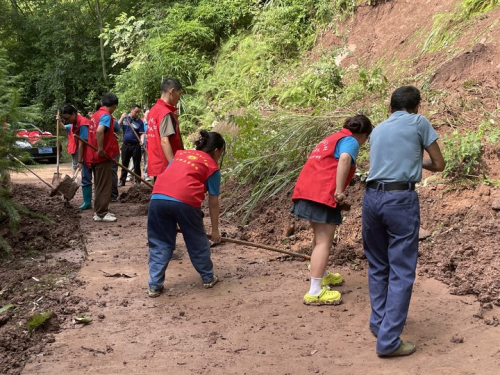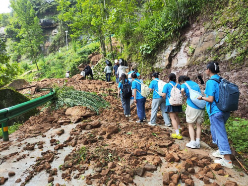 随着连续两天的暴雨停歇,石龙门村迎来了久违的阳光。据当地村民说:“这是迄今为止最大的一场暴雨”。在村党支部书记、村委会主任钟胜的带领下,志愿者们迅速转移阵地,面对塌陷的路段、沉重的行李和闷热的天气,实践团成员们没有丝毫退缩。村民们的热情相助,如接过我们手中的箱子、为团队成员开辟安全通道,以及在修整路面时的并肩作战,都深深打动了每一位实践团成员。
