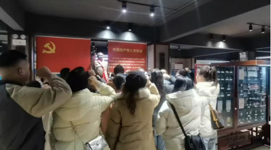 在四楼红色教育基地,党总支书记兰继华同志的带领所有同志举行了重温入党誓词活动,最后与毛主席雕像合影。