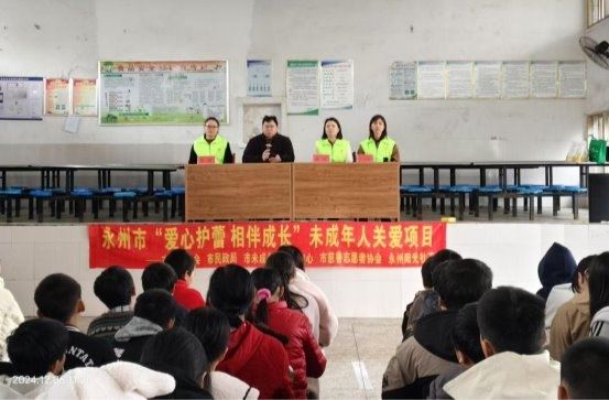 2024 年 12 月 6 日,在永州市慈善总会、永州市民政局、永州市未成年人保护中心的指导下,永州市慈善志愿者协会在道县乐福堂学校开展关爱未成年人“爱心护蕾,相伴成长”安全教育公益宣讲课及未成年人心理咨询疏导专场,以生动形象的案例、深入浅出的讲解以及互动性十足的问答环节,为全校师生带来了一堂别开生面的安全讲座。
