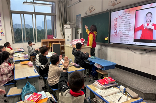 “红星闪闪放光彩,红星灿灿暖胸怀。红星是咱工农的心,党的光辉照万代……”学府小学三年四班的教室里传出一阵阵响亮的歌声,走近一看,小学生们脸上洋溢着笑容,手上还做着手势。原来是浙江工商大学杭州商学院会计学院的志愿者们在教小朋友们做《红星闪闪》手势舞。