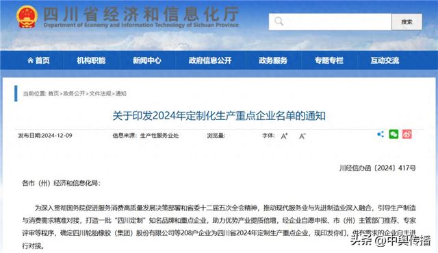为推动现代服务业与先进制造业深入融合,引导生产制造与消费需求精准对接,打造一批“四川定制”知名品牌和重点企业,助力优势产业提质倍增,经企业自愿申报、市(州)主管部门推荐、专家评审等程序,我省确定了四川轮胎橡胶(集团)股份有限公司等208户企业为四川省2024年定制生产重点企业。