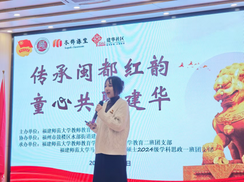 福州12月14日电(通讯员:潘荣鹏、邹佳妤)近日,一场意义非凡的福州红色文化进社区主题活动在福州市鼓楼区水部街道建华社区盛大开展。此次活动由福建师范大学教师教育学院主办,福建师范大学教师教育学院2022级小学教育二班团支部与马克思主义学院硕士2024级学科思政一班团支部共同承办,福州市鼓楼区水部街道建华社区全力协办,以“传承闽都红韵,童心共筑建华”为主题,致力于深入挖掘福州红色文化资源价值,传承红色革命精神与思想内涵,赓续红色基因,积极响应红色文化协同育人的号召。活动巧妙擦亮师范生育人实践品牌项目——木棉课堂,充分发挥专业优势,将红色文化资源与思政课程深度相融,为社区协同育人发展注入全新活力。