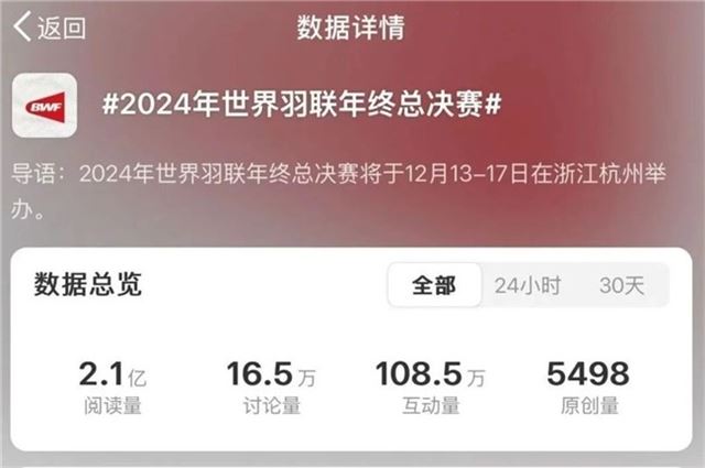 据统计,本次总决赛赛事期间,相关媒体共计发稿(包含视频)数量超过2000篇/次,微博平台#2024年世界羽联年终总决赛#话题阅读量超过2.1亿,相关赛事微博子话题累计阅读量超过6000万,赛事话题度与影响力可见一斑。