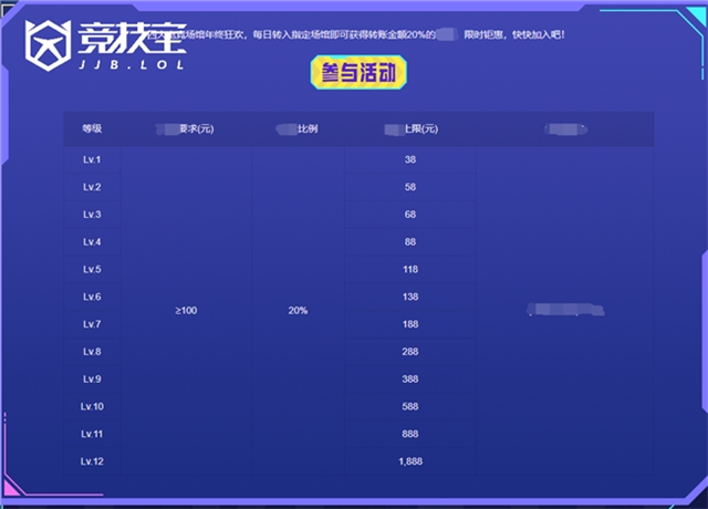 活动内容:本次活动主打一个回馈用户简单粗暴,参与方式非常简单,但活动奖励却非常重磅。活动期间,用户完成首次C值之后,通过活动页面转账到指定的电竞场馆就可以得到转入数目20%的额外奖励,最高可达1888元!另外每位用户在活动期间每天都可以参与一次本活动。