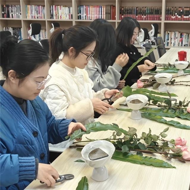 课堂上,花艺老师以其专业的知识和丰富的经验,就倾斜型花型的插花技法、插花步骤、花材选择、叶材处理、花叶搭配、注意事项等内容进行了详细讲解。随后,职工们在花艺老师的指导下,自己动手将一朵朵鲜花与一片片绿叶巧妙组合,创作出一件件赏心悦目的插花作品。现场欢声笑语不断,气氛热烈和谐。