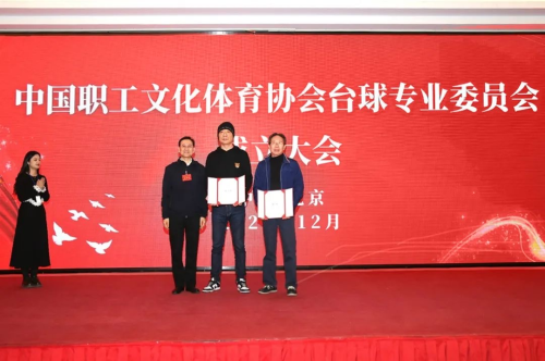 中国职工文化体育协会副会长姜波、副秘书长兰海燕,代表中国职工文化体育协会向台球专业委员会颁发牌匾