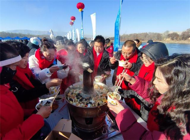 启动仪式上,贵德县人民政府副县长吉先加解读贵德县冬季旅游优惠政策,举行“突出贡献奖”旅行社表彰仪式,为2023年度优秀旅行社进行现场表彰。伴随着精彩的文艺演出,我们在现场设置的摄影展区、非遗文创产品展区、贵德隐市特色牛胸叉火锅和本地特色“土火锅”美食品尝区热闹非凡。干部群众围坐在一起,呈现出一幅祥和温馨的美好画面,热气腾腾的土火锅也为寒冬增添了一份惬意和温暖。