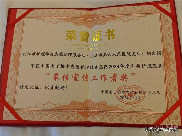 2024年12月23日,以“展志愿豪情,扬护理华章”为主题的中国南丁格尔志愿护理服务总队第十二届志愿者年会在吉林省吉林市隆重召开。会上,内江市第六人民医院职工胡文娟荣获中国南丁格尔服务总队2024年度志愿护理服务“最佳宣传工作者奖”。