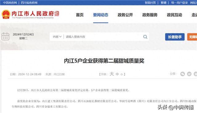 近日,内江市人民政府公布第二届甜城质量奖评定结果,5户企业获得第二届甜城质量奖,其中内江经开区2户。
