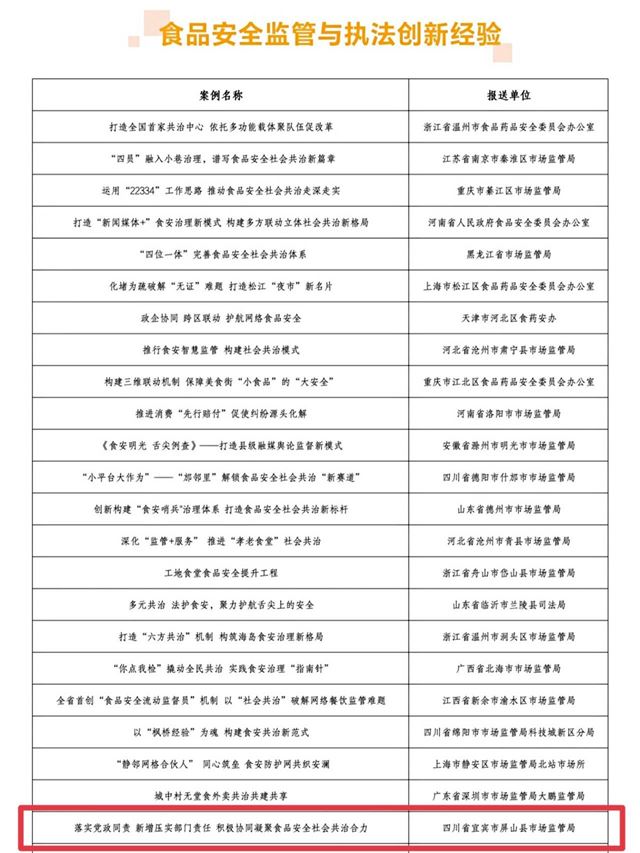 近日,中国工商出版社公布了全国第三届食品安全社会共治典型案例,屏山县报送的《落实党政同责新增压实部门责任积极协同凝聚食品安全社会共治合力》入选“食品安全监管与执法创新经验”案例,这是国家层面第三次登载屏山县食品安全工作经验做法。本届案例征集活动,在市场监管总局食品协调司的指导下,中国工商出版社经组织专家多轮评审,并报市场监管总局相关司局审核把关,最终遴选出6大领域92个典型案例。