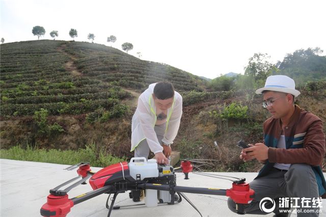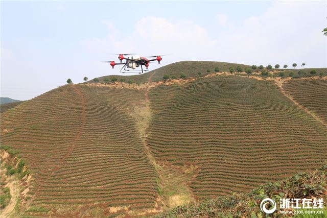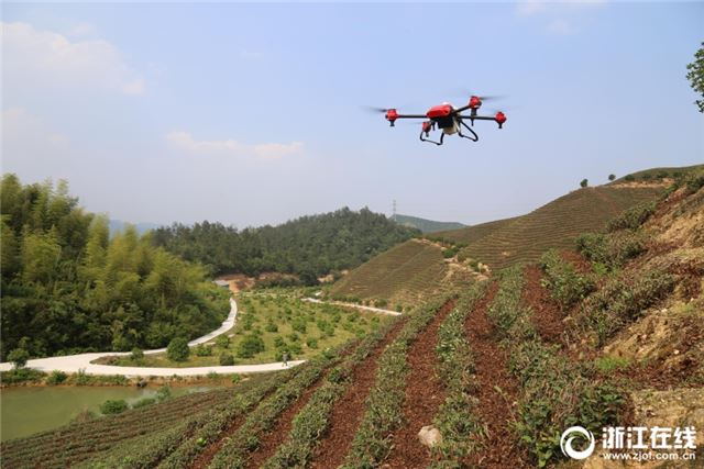 5月14日,湖州市吴兴区埭溪镇长林农庄的茶山,无人机正在喷洒药水。负责人称,茶场目前种植各类茶叶800多亩,采用无人机喷洒药水,不仅可以大幅提高效率,而且节省成本。(浙江在线拍友 邓德华 摄)