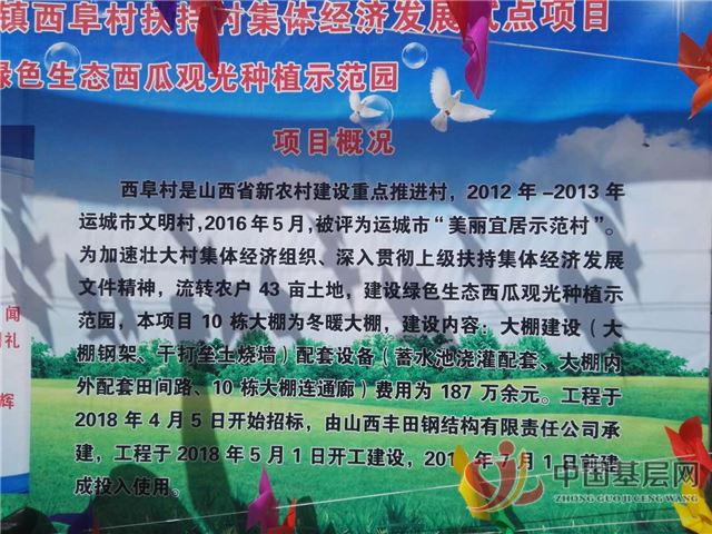 中国基层网运城讯(通联部主任张明 通讯员梁军)闻喜县郭家庄镇西阜村,是山西省新农村建设重点推进村。2012年_2013年运城市文明村,2016年5月,被评为运城市“美丽宜居示范村”。李明虎书记为加速壮大村集体经济组织,深入贯彻上级扶持集体经济发展文明精神,流转农户43亩土地,建设绿色生态西瓜观光种植示范园。本项目10栋大棚为冬暖大棚,建设内容:大棚建设(大棚钢架,干打垒烧墙),配套设施(蓄水池浇灌配套,大棚内外配套田间路,10栋大棚连通廊)费用为187万余元。工程于2018年4月5日开始招标,由山西丰田钢结构有限公司承建,工程于2018年5月1日开始建设,2018年7月1日前建设投入使用。