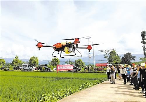 7月19日,云南省大理州巍山县蓝图农机专业植保服务队利用植保无人机对水稻进行病虫害防治。当地农业部门在永建镇永和村村委会组织开展水稻病虫害专业化统防统治,确保今年水稻丰产丰收。 张树禄摄