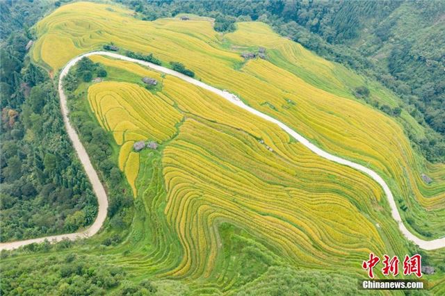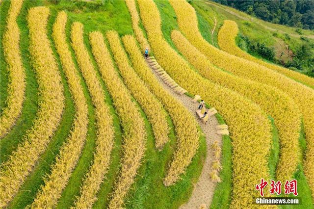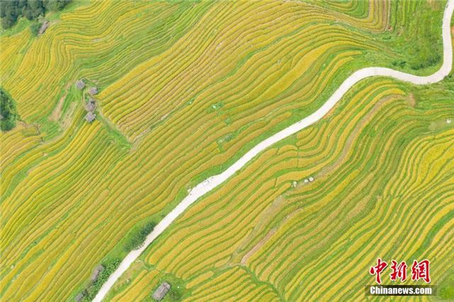 9月11日,航拍贵州省榕江县阳开梯田秋色,农民在田间劳作。金秋时节,贵州省榕江县计划乡阳开梯田水稻进入成熟期,金黄色的梯田构成了一幅美丽的秋天图景。 中新社记者 贺俊怡 摄