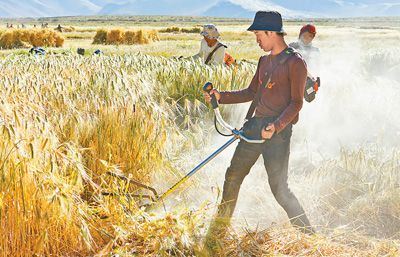 图为9月13日,西藏定日县长所乡的农民在收割青稞。
