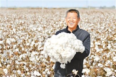目前,河北省南宫市40万亩棉花迎来采收季。图为一名棉农在展示收获的新棉。