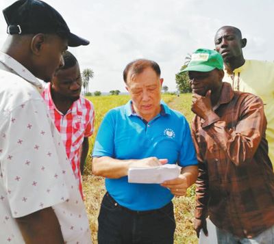 黎志康(中)在尼日利亚田间指导该国国家谷类作物研究所的育种家。