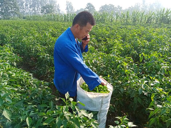“喂,张老板你好,我正在和我老婆一起采摘菜椒呢,今天还是一千多斤,和昨天的斤数差不多。为了给你配货我们一大早就开始干活了,放心吧,再有半个小时就可以把辣椒送到你的收购点上……”2021年8月2日,安徽亳州谯城区谯东镇菜农崔宏广一边接电话,一边招呼妻子抓紧采摘辣椒。