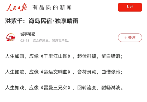 春风习习,茶香悠悠,樱花朵朵;卉木萋萋,仓庚喈喈,采蘩祁祁。今天,走进位于浙东鄞州区横溪镇的宁波市鄞州柯青家庭农场的茶山里,置身这片40万平方米的茶山和集雨面积达39.8平方公里的金鹅湖(横溪水库)中,此时此刻豁然开朗,只愿疫情早日殆尽;此情此景仿佛“千里江山图”呈现眼前,令人情不自禁地吟诵:2022年2月16日发表于人民日报《洪紫千:海岛民宿·独享晴雨》一文: