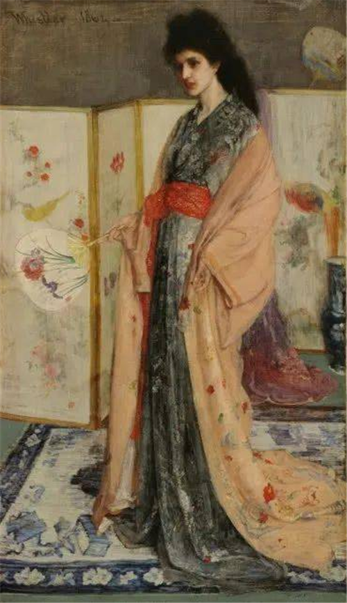 1863年,惠斯勒受邀希腊总领事为领事的女儿画肖像画,而当时的惠斯勒正醉心日本文化背景中,于是自作主张为女主角穿上和服、配上日本器物与背景,画中的蓝白双色地毯和右侧隐约可见的青花花瓶又明显是“中国风”,可见惠斯勒对“陶瓷王国”的印象实则并非某个特定“国家”,而是一种文化印象。