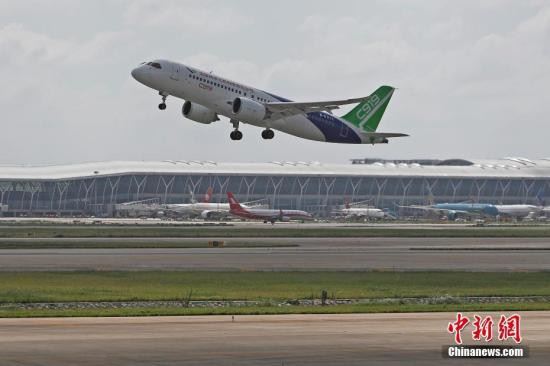 C919客机102架机在浦东国际机场第四跑道起飞。 殷立勤 摄