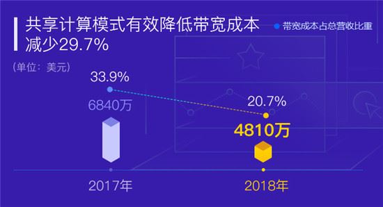 财报显示,2018年迅雷营收成本为1.2亿美元,占据总营收的49.8%。其中,带宽成本为4,810万美元,占据总营收的20.7%,对比2017年带宽成本为6,840万美元,占据总营收的33.9%。