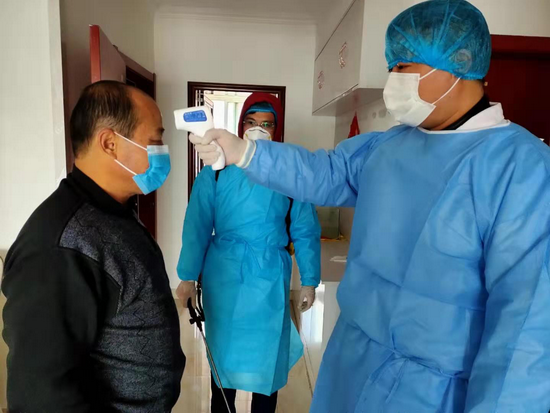 医护人员走进社区村庄对隔离人群进行检测消毒