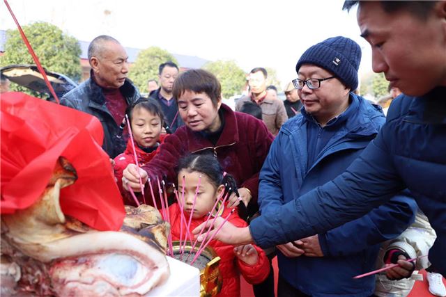 当日上午,各路宾朋好友迎着冬日温暖的阳光,纷纷前往大典现场汇聚,亲微身体验宰杀年猪全过程,购买湘安猪肉做年货,湘安猪认养人发表感言,主持人代表众人诵读祭文,参加活动的各界人士向猪王敬献祭品、焚烧香裱,以示崇敬。