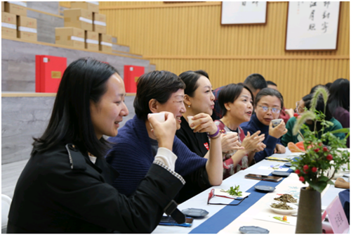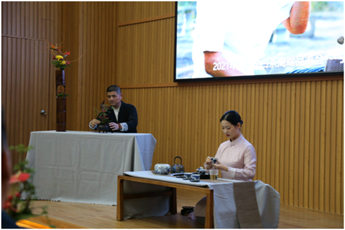 自古以来,“点茶、挂画、插花、焚香”作为“文人四艺”广泛流行于文人雅集活动。大家认真观看了国家级插花大师童秋勇和岩上旗舰店首席茶艺师陈越越的插花和茶艺表演。