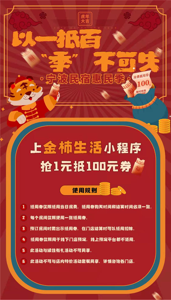 一、订房有礼,以一抵百。上“金柿生活”微信小程序,购买抵用券,1元购入100元券,房价立减。使用规则:抵用券仅限抵用当日房费,抵用券购买时间和结算时间必须一致;每个房间仅限使用一张抵用券;预订房间时需出示抵用券,在门店结算时可以抵用扣除。抵用券仅限用于线下门店预定,线上预定平台都不适用;此活动与续住有礼活动不可同享;此活动不可于店内特价活动套餐同享,详情咨询各门店。