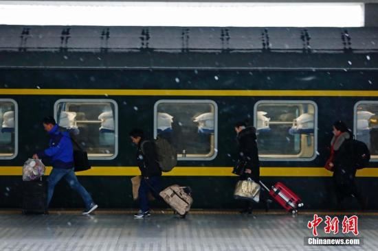1月25日,旅客们背着行李冒雪在铁路上海站乘坐火车前往中国各地。 中新社记者 殷立勤 摄