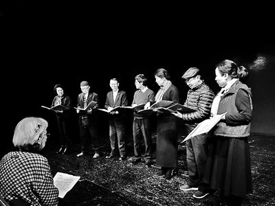 在东城区建国门文体中心,“金宝街北戏剧公社”的社员正在排练曹禺的话剧《日出》,担任话剧指导的是北京人民艺术剧院著名演员李滨。从2011年开始,李滨为社区居民义务指导排话剧,还定期举行话剧讲座。在她看来,排戏就是为了还原历史。