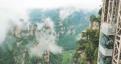 最近,连续强降雨过后的湖南张家界武陵源天子山、十里画廊、水绕四门等景区,飘渺的云海穿梭萦绕在峰林沟壑间,宛如水墨仙境。图为游人乘张家界百龙天梯欣赏云海峰林景色。
