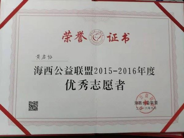 事业扩大的同时,黄启协还不忘回馈社会,多年来一直致力于公益事业,投身于德化县志愿者活动之中,为家乡事业建设贡献自己的一份心力。可以说,黄启协在当地树立起了农民创业的榜样,并为其他农民创业起了很好的示范作用。