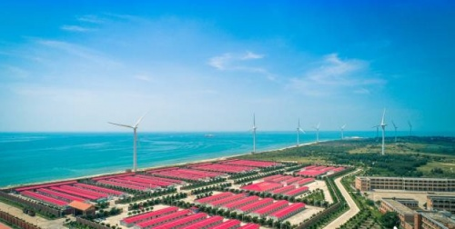汕尾陆丰市湖东镇南侧海域,近百台白色风机昂首挺立在碧波万顷的海面上,一阵海风吹过,风机迎风起舞、飞速转动;不远处的碣石镇海洋工程基地,施工的轰鸣声与风电机配件生产线上的机器声交织,上百支风叶在产业园空地上一字排开,一座“海上风电之城”呼之欲出。