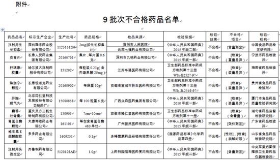 深圳翰宇药业股份有限公司生产的批号为1123161204的注射用生长抑素,长春人民药业集团有限公司生产的批号为20160701的安胃片,哈尔滨大洋制药股份有限公司生产的批号为151202的肝速康胶囊,长春银诺克药业有限公司生产的批号为20160902的降脂宁颗粒,北京同仁堂科技发展股份有限公司制药厂生产的批号为15080858的开胸顺气丸,重庆灵方三帆生物制药有限公司生产的批号为150903的麝香壮骨膏,太康海恩药业有限公司生产的批号为161101的胃蛋白酶颗粒,多多药业有限公司生产的批号为1609231的维生素E烟酸酯胶囊,齐鲁制药有限公司生产的批号为5120108AE的注射用头孢拉定。