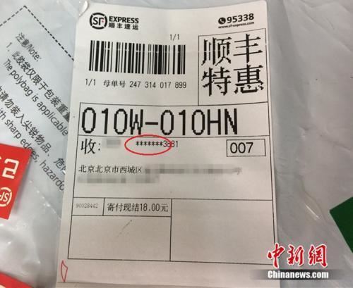 资料图:一张快递单上,收件人手机号码被部分隐藏。中新网 邱宇 摄