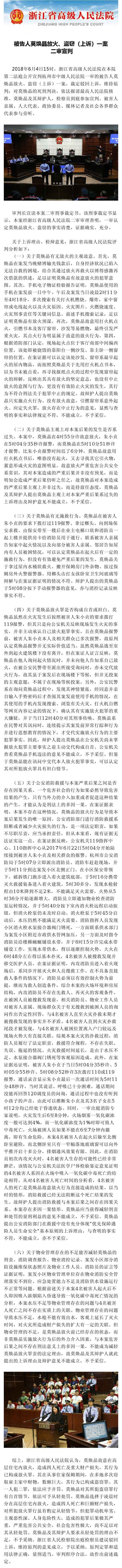 人民网北京6月4日电 据浙江省高级人民法院微博消息,今天下午,浙江省高级人民法院公开宣判杭州市中级人民法院一审的被告人莫焕晶放火、盗窃(上诉)一案,裁定驳回上诉,维持原判;对莫焕晶的死刑判决,依法报请最高人民法院核准。