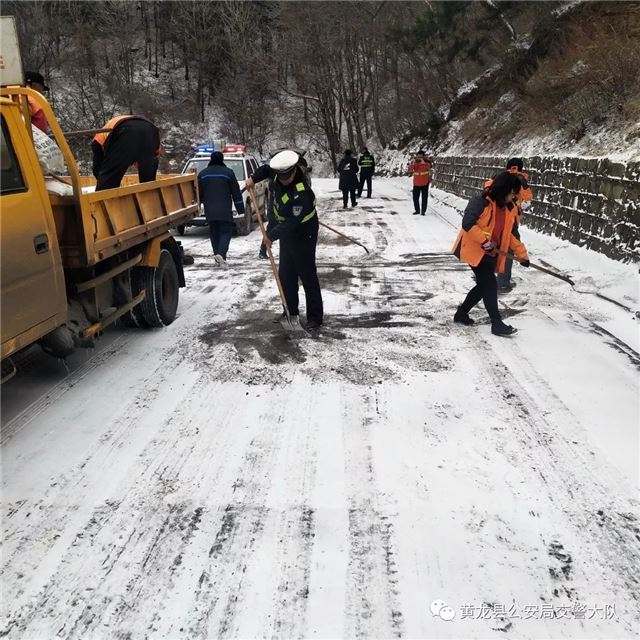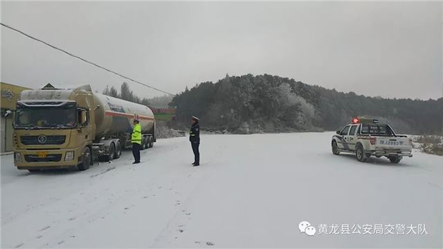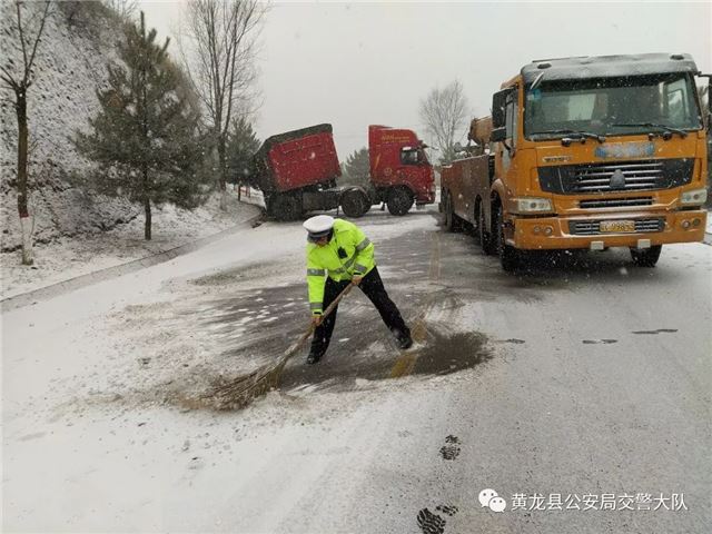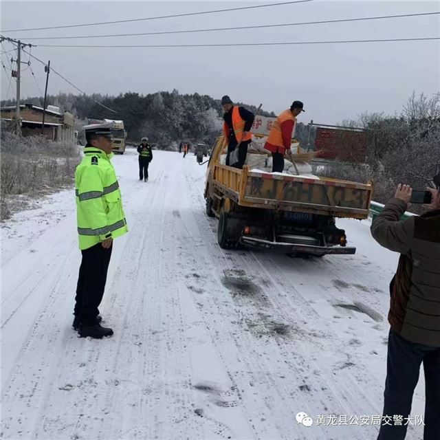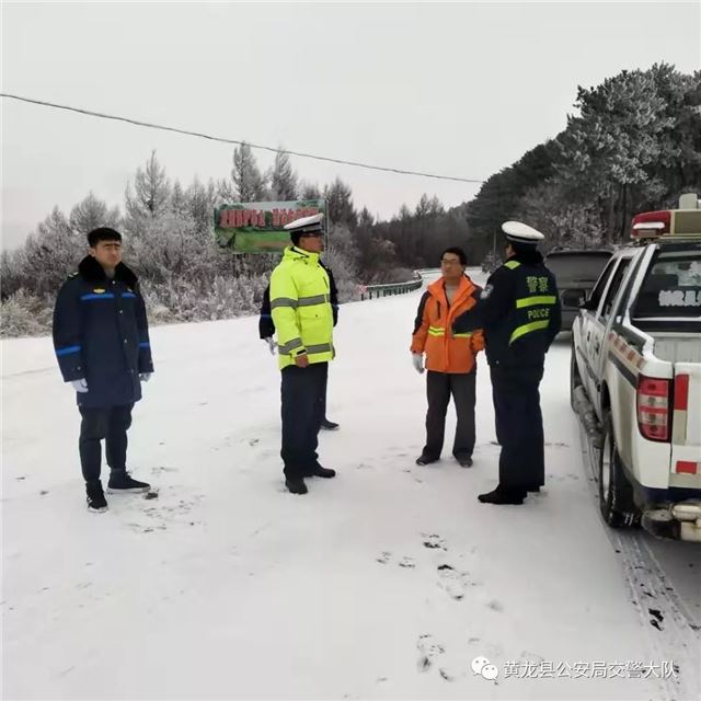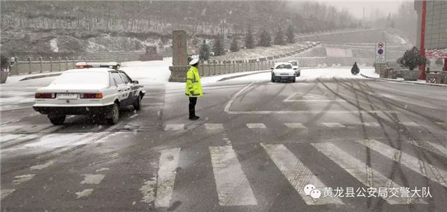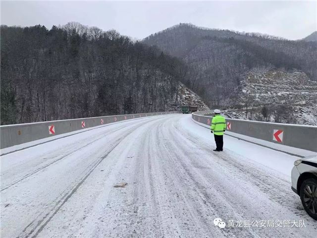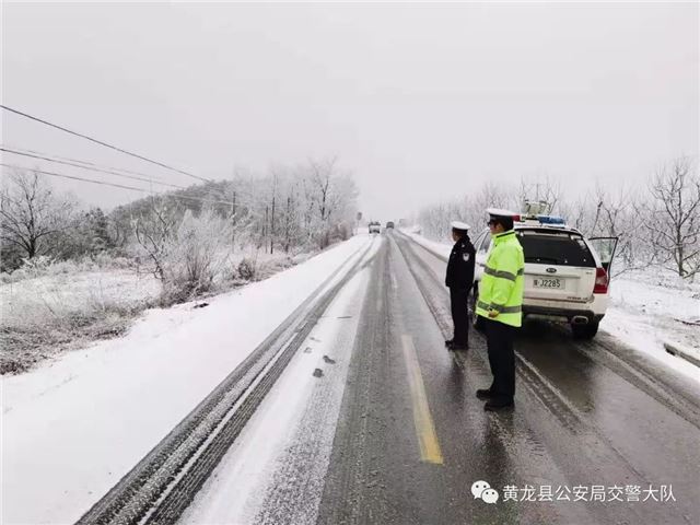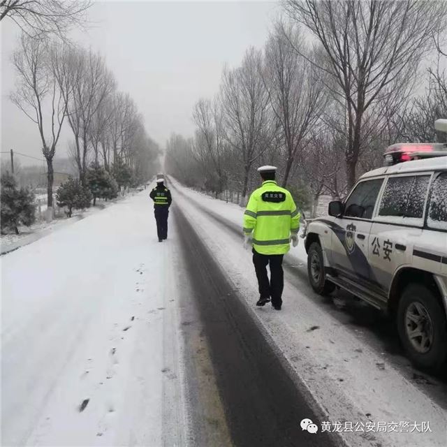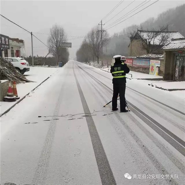 自11月29日晚开始,黄龙辖区出现了降雪天气,漫天飞雪飘来,大地随即变成了银白色的世界,这美丽的雪景,也给广大群众的出行带来诸多不便和安全隐患。黄龙县公安局交警大队立即启动应急预案,全警出动,加大路面巡逻管控力度,加强交通引导,快速处置疏通车辆安全有序通行,同时联系路政等部门开展融雪除冰等工作,利用手机短信平台、微信、微博发送实时路况和安全出行提示,全力确保群众出行安全和辖区交通畅通。