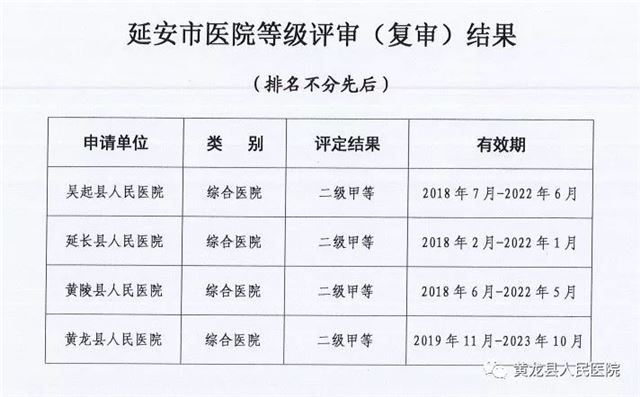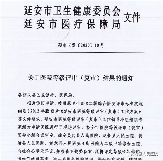 2020年1月21日,从延安市卫生健康委传来喜讯,黄龙县人民医院成功创建为国家二级甲等综合医院