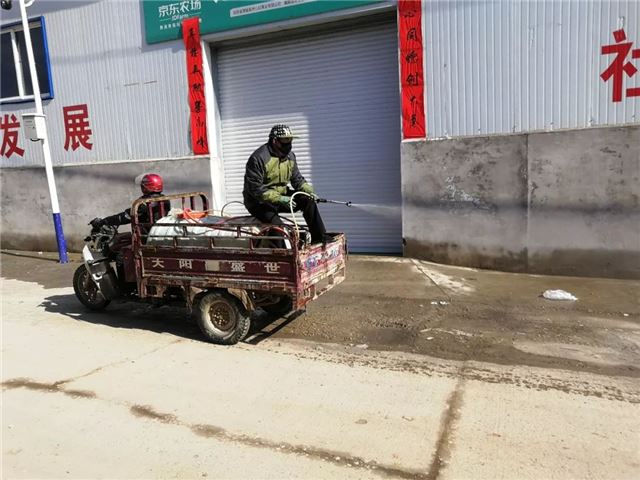 安子头贫困户赵寇锁和党俊贤为村道进行消毒