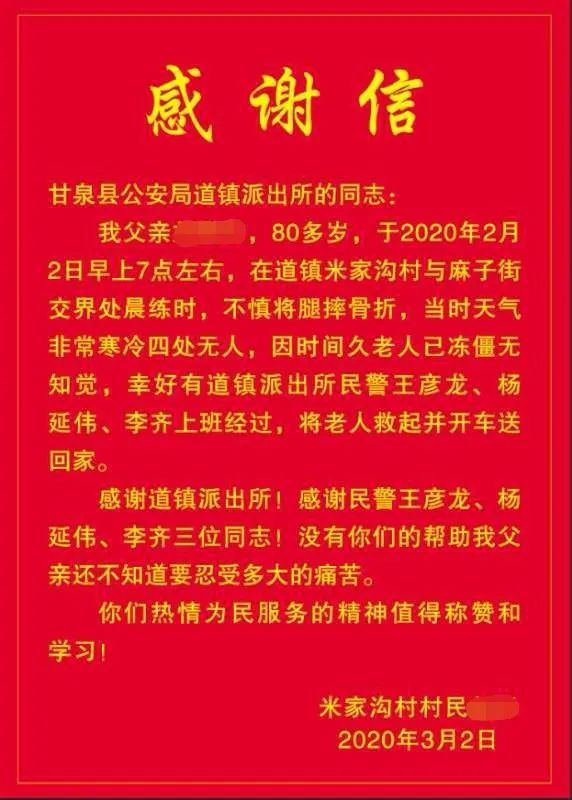 3月2日,道镇米家沟村村民给甘泉县公安局道镇派出所民警送去了一面写着“为民服务暖人心 排忧解难似亲人”的锦旗,感谢派出所民警对他们的帮助。