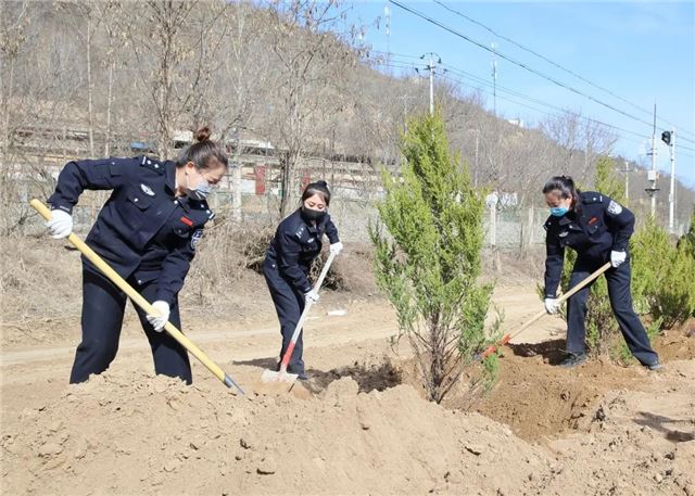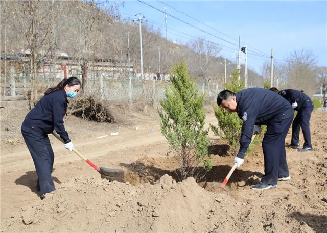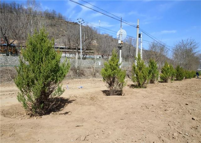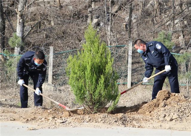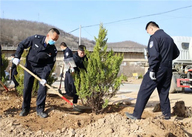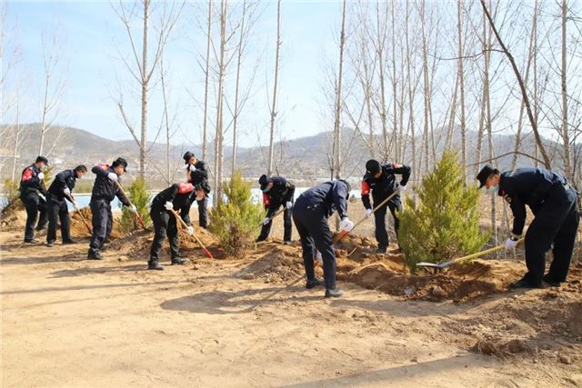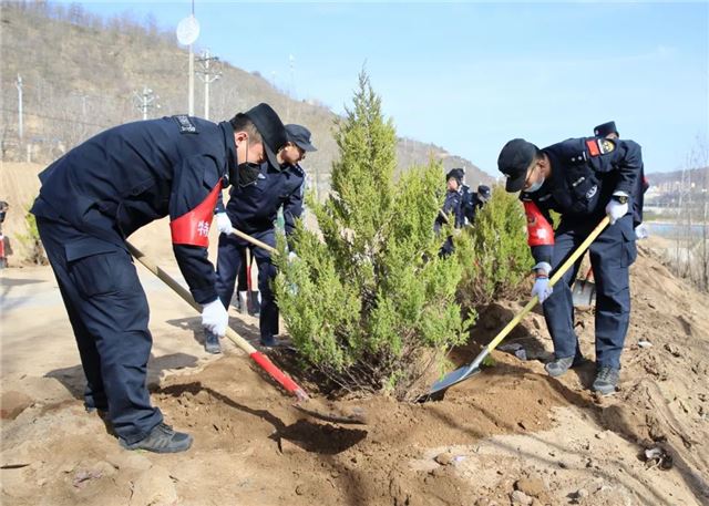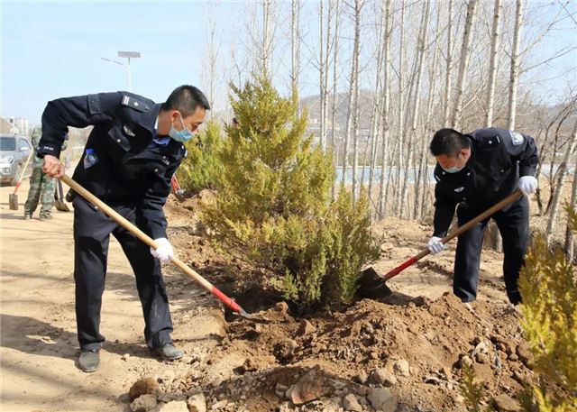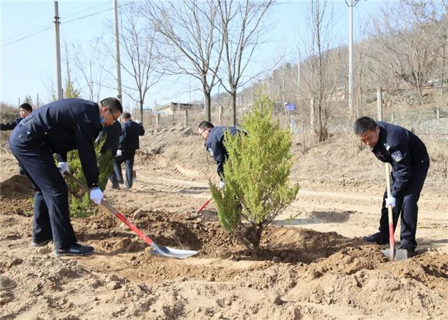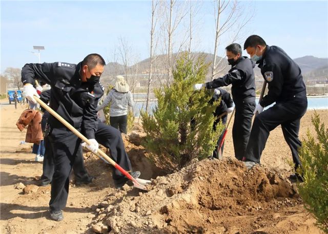 植树活动中,甘泉县公安局100余名民警,三五人一组,搬运树苗、挥锹铲土、扶树填坑、浇水灌溉...... 大家分工明确,配合默契,把每个步骤都做得一丝不苟,整个植树活动现场呈现出一片热火朝天的景象。虽然大家的双手、裤子、鞋子上都沾满了泥土,但依旧热情高涨干劲十足。经过一上午的努力,大家用辛勤的劳动和汗水把美水泉村道路两侧都栽上了绿油油的刺柏树。在阳光的照射下,连片的刺柏树,把美水泉村装点得更加生机盎然。