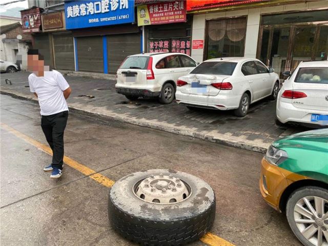为进一步加强大货车交通安全管理工作,按照总队、支队统一部署,黄陵县公安局交警大队安排,7月14号店头交巡警中队民辅警在店头小学坡底开展“大货车百日整治”统一行动。执勤民警在巡逻时恰巧目睹该起事故发生的全过程:一辆重型自卸货车从中心街北二路路口左转弯途中右前方一轮胎突然脱落,越过公路,砸中一侧停靠在凯越酒店楼下停车位上的白色轿车,导致白色轿车尾部大面积受损,重型自卸货车不明情况,驶离。执勤民警通知事故处理民辅警尽快到达现场的同时,找寻轿车车主。