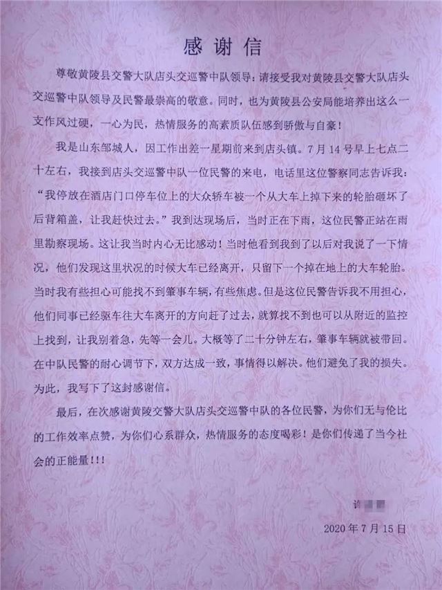 轿车车主许某某于7月16日下午特地送来感谢信感谢店头中队事故处理民警办案神速,真真正正为人民服务的工作态度。货车驾驶员王某在交警的要求下特发货车驾驶人朋友圈,提醒广大货车驾驶人:树立安全行车意识,经常检查车辆安全系数状况,遵守交通法规,维护矿区交通卫生。同时,店头中队民警也在辖区大货车驾驶人微信群发送安全提示信息。