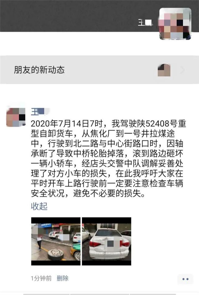 事故处理民警李彤、赵亮火速赶赴现场,详细勘查后很快调取了事故现场附近的监控录像,确定货车车牌号,根据中队重型自卸货车台账找到驾驶人王某的联系方式,电话通知王某前往中队作进一步调查处理。经询问得知,王某从黄陵煤化工公司到一号煤矿运煤,不知道什么时候轮胎滚落,没想到发生这么惊险的意外事故,幸好没有造成行人受伤。到达煤矿后,下车才发现车辆右侧中桥轴承断裂,造成行驶中轮胎甩落,接到电话后马上赶到店头交巡警中队处理。在了解事情的原委后,民警判定王某负此次事故的全部责任,对方车辆损失由王某全部承担,并告诫王某在上路行驶前要仔细检查车辆状况,避免此类事故再次发生。