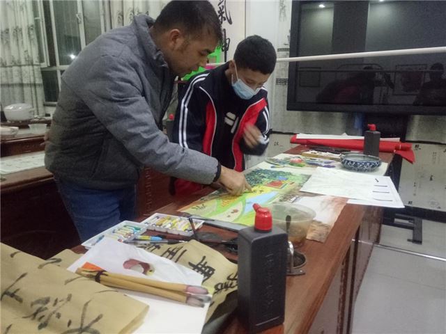 疏附县第三中学的广东援疆教师黄华平是三中书画社团的指导教师。在日常教学中,黄华平老师将有书画兴趣的学生组织起来,因材施教,分段式教授中国传统文化中的书法、篆刻、中国画等传统艺术课程,紧扣传统文化教学,助推书法进课堂,书画社团进校园。黄华平老师不断的创新授课形式,增设书画作品的展示平台,激发学生的学习兴趣,提高学习的成就感,把中华优秀传统文化传播到边疆的校园文化中,让更多的孩子们感受到传统文化的魅力。
